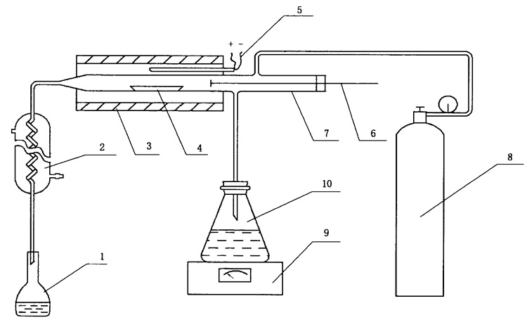 1-容量瓶;2-冷凝管;3-高溫爐;4-瓷舟;5-鉑銠一鉑熱電偶;6-進樣推棒;7-燃燒管;8-氧氣鋼瓶;9-調(diào)溫電爐;10 -平底磨口燒瓶。 按圖所示裝配好全套儀器,連接好電路、氣路和水路各個系統(tǒng),將高溫爐升溫到1100℃。往燒瓶中加入約300 mL水并加熱至沸騰,冷凝管通入冷水。塞緊進樣推棒硅膠塞,在平底燒瓶中水沸騰之前通人氧氣,調(diào)節(jié)氧氣流量為400 mL/min,檢查系統(tǒng)不漏氣后,通入水蒸氣和氧氣空蒸15 min。 操作試驗步驟 稱取(0.50±0.01)g 一般分析試驗煤樣(稱準至0.1 mg)和0.5 g石英砂放在瓷舟里小心混合均勻,再用約0.5 g石英砂鋪蓋在上面。將100 mL容量瓶放在冷凝管下端接收冷凝液。取下進樣推桿,把瓷舟放入燃燒管內(nèi),插入進樣推桿,塞緊硅膠塞。將瓷舟的前端推到預先測好的約300℃區(qū)域停留5 分鐘,接著推進到約600℃區(qū)停留5分鐘,再推進到約900℃區(qū)停留5分鐘,最后把瓷舟推到1100℃的恒溫區(qū),拔出進樣推桿以免融化,樣品在恒溫區(qū)繼續(xù)燃燒分解15分鐘。在整個操作過程中,調(diào)節(jié)燒杯內(nèi)水的蒸發(fā)量,水解開始15分鐘內(nèi),容量瓶中每分鐘收集約3mL,后15分鐘,每分鐘收集約2.5 mL,最后總體積應控制在85 mL以內(nèi)。燃燒-水解完成后,移走容量瓶。停止通氧氣,取下送樣推棒,取出燃燒舟。 測量電位 在100 mL燒杯中加入一定量的水,連接好電位測量裝置,開動攪拌器,更換燒杯中水數(shù)次,直至毫伏計顯示的電位值達到氟電極的空白電位。 在5個用水沖洗過的100 mL容量瓶中,分別加入100 ug/mL的氟標準工作溶液1 mL,3 mL,5mL,7 mL,10 mL,加入3滴溴甲酚綠指示劑,10 mL總離子強度調(diào)節(jié)緩沖溶液,用水稀釋到刻度,搖勻,靜置30分鐘。 計算結(jié)果: 煤中氟的含量(Fad)按下面公式)計算,測定結(jié)果修約到個位。